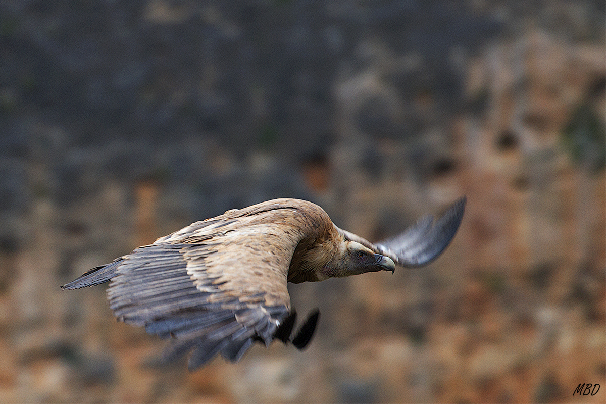 En esta toma he conseguido un punto de vista mucho más interesante que en la anterior, al situarme a la altura del buitre, mostrando su dorso y un enfoque selectivo a la cabeza, bien iluminada. El fondo da cuenta del ambiente donde se desenvuelve la acción, yel movimiento que transmite el progresivo desenfoque de las alas conjuntamente con el aleteo perceptible en las puntas de las alas dan un plus a la toma.