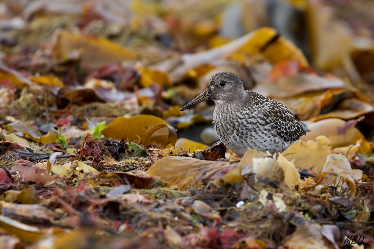 Una especie que no he podido ver en España aún, donde por lo que leo suele llegar a invernar a la costa norte. A estos los vi en la costa noroeste de Islandia, buscando alimento entre las algas acumuladas en la costa rocosa. En principio se mostraban tímidos y mantenían las distancias, pero tras unos minutos de inmovilidad y en cuclillas sobre las rocas, alguno de ellos se acercó un poco. Quise incluir en la imagen el lecho de algas con texturas muy atractivas.
