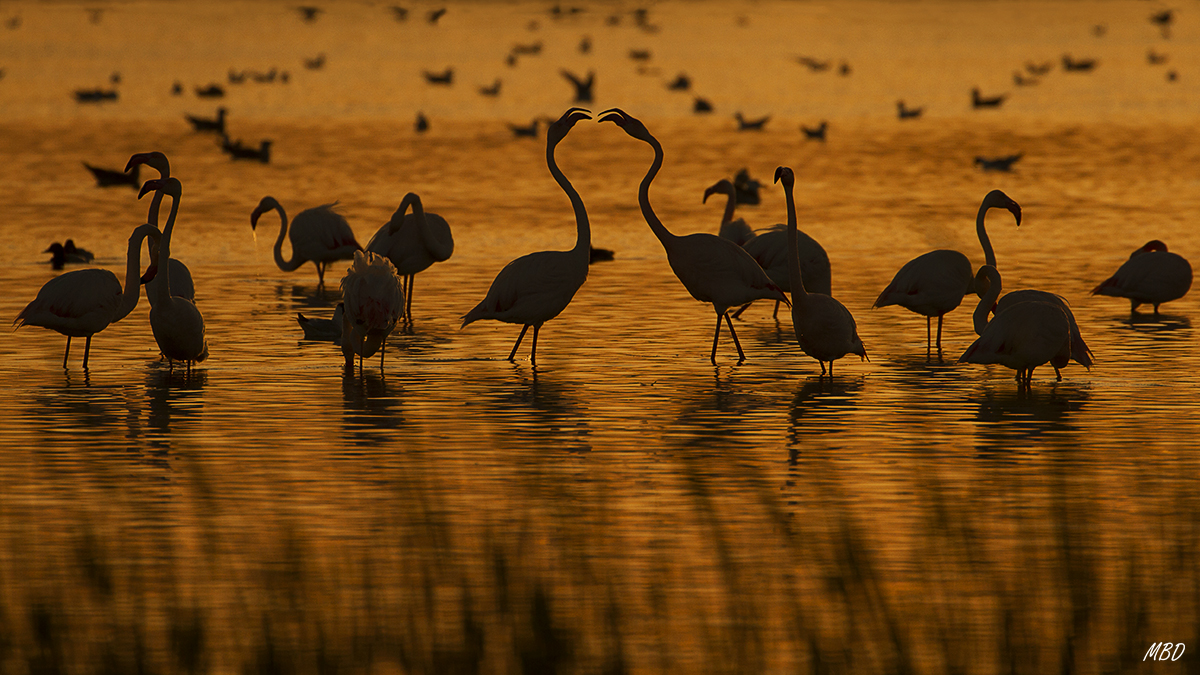 El sol se retira ya entre luces arrebatadas. Gaviotas y flamencos ponen la banda sonora a la tarde, ¡aunque esto es difícil captarlo en las fotos! Pruebo encuadres, siempre complicado encontrar los puntos de interés cuando son muchos los individuos. De pronto surge la oportunidad: la pelea de los dos flamencos, en la parte central del grupo, capta mi atención y disparo por intuición, intentando no cortar ninguna de las aves. La foto está re-encuadrada a formato 16 x 9, para eliminar la parte de arriba, que incluía una banda oscura provocada por la otra orilla y que no me gustaba. Mejor en formato panorámico.