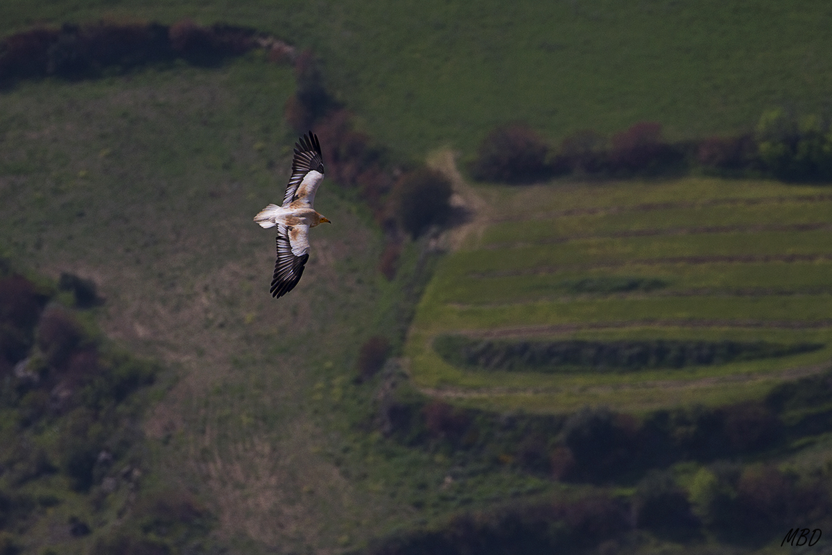 Obtuve la foto desde la cornisa del mirador de los buitres un día de mucho viento, que hacía que las aves se quedaran en sus vuelos a baja altura, a resguardo de la pared. Este alimoche me dio muchas oportunidades, algunas más cercanas que esta, pero sin embargo me gusta más este encuadre abierto, mostrando un punto de vista cenital, casi subjetivo respecto a lo que debe ver el alimoche en su vuelo, y mostrando su entorno.