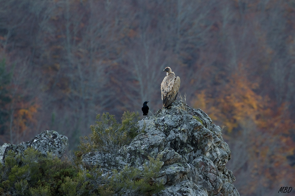 Titulé esta imagen “Compartiendo atalaya”, describiendo su historia de este modo: “Ha habido batida de caza (jabalí). Los buitres han tenido su parte, y ya a última hora, alguno se demora en posaderos aledaños. La corneja elige la misma roca, y hasta intenta hostigar al buitre al principio, pero rápidamente se firma la paz . Una paz que se extiende al hayedo semidesierto a estas horas, y ya casi sin hojas. Me gustó el perfil de ambas aves, contemplándose tranquilas y recortándose contra ese fondo aún con alguna pincelada de color otoñal.”Esa es la atmósfera que traté de captar con este encuadre abierto.